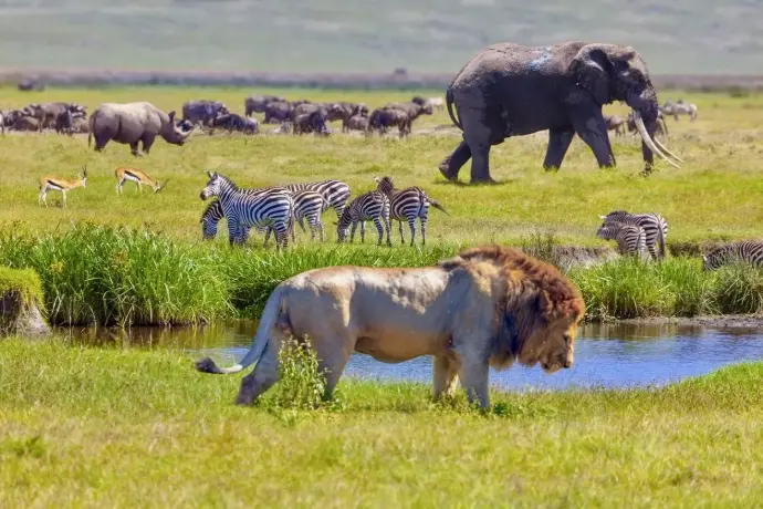 cuya escasa vegetación permite una de las mejores vistas de vida silvestre del mundo. Dependiendo del movimiento del animal, podemos organizar un almuerzo para llevar o regresar al albergue para un almuerzo caliente. La noche es libre para descansar.